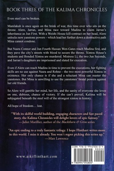 Even steel can be broken. Mamlakah is once again on the brink of war, this time over who sits on the throne. Alere, Jarran, and Mina race toward Madina to claim Jarran's inheritance as Jun First. And with a Weishi House kill-contract on her head, Alere must unlock new yanstone powers - which lead her further down a destructive path Mina cannot condone. But Nasra Connor and Jun Fourth Hassan Wen-Gates reach Madina first, and they pave the city's streets with blood to secure the throne. Xintou House's students and Bonded Xintou are murdered. Mistress Li, the two Jun Seconds, and Jarran's daughters are imprisoned and slated for execution. Even if Alere can reach Madina in time to prevent the executions, her fighting skills are no use against Nasra and Rohne - the two most powerful Xintou in existence. Her only chance is if she and a reluctant Mina can master the yanstones. But Mina is unwilling to use the yanstones' brutal powers against her old friends. So Alere will gamble her mind, her life, and the sanity of everyone she loves on one, dubious, chance of victory. If she can't prevail, Kalima will be subjugated beneath the steel will of the strongest xintou in history. All chance of freedom… lost. "The Kalima Chronicles will delight lovers of epic fantasy" - Juliet Marillier, author of Blackthorn and Grim series.