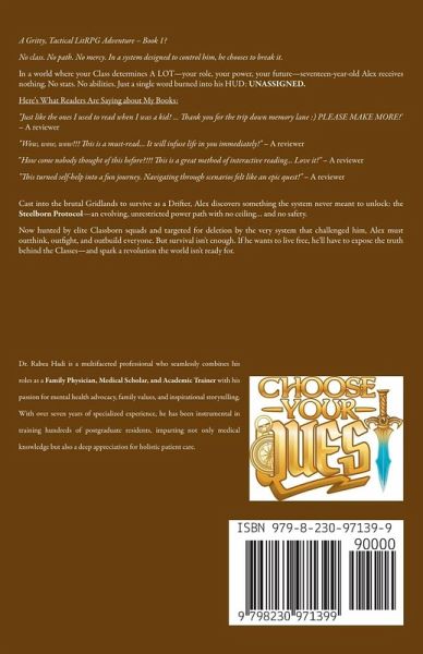 A Gritty, Tactical LitRPG Adventure - Book 1? No class. No path. No mercy. In a system designed to control him, he chooses to break it. In a world where your Class determines A LOT-your role, your power, your future-seventeen-year-old Alex receives nothing. No stats. No abilities. Just a single word burned into his HUD: UNASSIGNED. Here's What Readers Are Saying about My Books: ¿ "Just like the ones I used to read when I was a kid! ... Thank you for the trip down memory lane :) PLEASE MAKE MORE!" - A reviewer ¿ "Wow, wow, wow!!! This is a must-read... It will infuse life in you immediately!" - A reviewer ¿ "How come nobody thought of this before?!!! This is a great method of interactive reading... Love it!" - A reviewer ¿ "This turned self-help into a fun journey. Navigating through scenarios felt like an epic quest!" - A reviewer Cast into the brutal Gridlands to survive as a Drifter, Alex discovers something the system never meant to unlock: the Steelborn Protocol-an evolving, unrestricted power path with no ceiling... and no safety. Now hunted by elite Classborn squads and targeted for deletion by the very system that challenged him, Alex must outthink, outfight, and outbuild everyone. But survival isn't enough. If he wants to live free, he'll have to expose the truth behind the Classes-and spark a revolution the world isn't ready for. Tactical. Gritty. Smart. This is not a story about overpowered spells or random-based leveling. This is the rise of a ghost in the system. This is Steelborn.