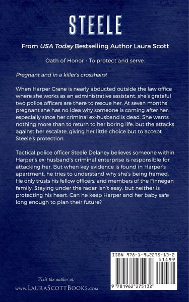 From USA Today Bestselling Author Laura Scott Oath of Honor - To protect and serve... Pregnant and in a killer's crosshairs! When Harper Crane is nearly abducted outside the law office where she works as an administrative assistant, she's grateful two police officers are there to rescue her. At seven months pregnant she has no idea why someone is coming after her, especially since her criminal ex-husband is dead. She wants nothing more than to return to her boring life, but the attacks against her escalate, giving her little choice but to accept Steele's protection. Tactical police officer Steele Delaney believes someone within Harper's ex-husband's criminal enterprise is responsible for attacking her. But when key evidence is found in Harper's apartment, he tries to understand why she's being framed. He only trusts his fellow officers, and members of the Finnegan family. Staying under the radar isn't easy, but neither is protecting his heart. Can he keep Harper and her baby safe long enough to plan their future?