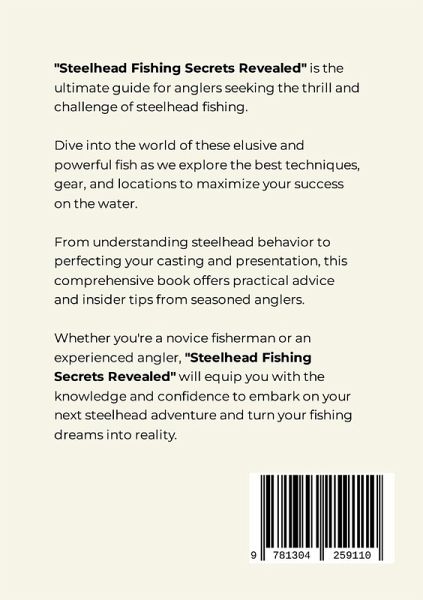 "Steelhead Fishing Secrets Revealed" is the ultimate guide for anglers seeking the thrill and challenge of steelhead fishing. Dive into the world of these elusive and powerful fish as we explore the best techniques, gear, and locations to maximize your success on the water. Whether you're a novice fisherman or an experienced angler, "Steelhead Fishing Secrets Revealed" will equip you with the knowledge and confidence to embark on your next steelhead adventure and turn your fishing dreams into reality. Here's a little of what you'll discover inside this book: - Anatomy and Biology of Steelhead Trout - The Best Steelhead Fishing Rivers in North America - Techniques for Fly Fishing Steelhead - Gear and Equipment Essentials for Steelhead Fishing - Understanding Steelhead Behavior and Migration Patterns - Conservation Efforts and Challenges in Steelhead Fishing - The Art of Spey Casting for Steelhead - Fishing Ethics and Responsible Angling Practices - Tales and Legends of Steelhead Fishing - How to Tie Effective Steelhead Flies - Strategies for Catching Steelhead in Different Seasons - Famous Steelhead Fly Patterns and Their Origins - Fishing Tactics for Great Lakes Steelhead - The Impact of Climate Change on Steelhead Populations - Steelhead Fishing in Coastal vs. Inland Waters - Steelhead Fishing: Solo vs. Guided Trips - Steelhead Fishing Hotspots Around the World - The Culture and Community of Steelhead Anglers - Steelhead Fishing: Wet Fly vs. Dry Fly Techniques - Catch and Release Practices: Maximizing Survival Rates - Steelhead Fishing: From River to Table - Steelhead Fishing Gear Reviews and Recommendations - The Psychology of Steelhead Anglers: What Drives Passion? - Steelhead Fishing: A Family Tradition - The Health Benefits of Steelhead Fishing - Steelhead Fishing Competitions and Tournaments - Steelhead Fishing: Night vs. Day Strategies - Steelhead Fishing in Remote and Wilderness Areas - Steelhead Fishing in Different Weather Conditions - Steelhead Fishing: Catching Trophy-Sized Fish - The Zen of Steelhead Fishing: Finding Peace in Nature - Steelhead Fishing: Challenges and Triumphs - The Role of Hatcheries in Steelhead Population Management - Steelhead Fishing Techniques for Beginners - Steelhead Fishing: Fishing from Shore vs. from a Boat - Steelhead Fishing: Fishing Solo vs. with a Partner - And More!