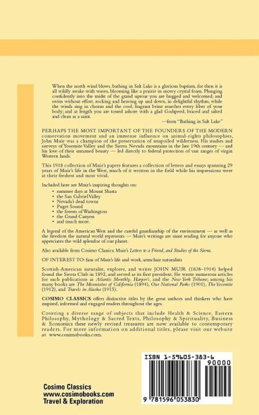 When the north wind blows, bathing in Salt Lake is a glorious baptism, for then it is all wildly awake with waves, blooming like a prairie in snowy crystal foam. Plunging confidently into the midst of the grand uproar you are hugged and welcomed, and swim without effort, rocking and heaving up and down, in delightful rhythm, while the winds sing in chorus and the cool, fragrant brine searches every fiber of your body; and at length you are tossed ashore with a glad Godspeed, braced and salted and clean as a saint. -from "Bathing in Salt Lake" Perhaps the most important of the founders of the modern conservation movement and an immense influence on animal-rights philosophies, John Muir was a champion of the preservation of unspoiled wilderness. His studies and surveys of Yosemite Valley and the Sierra Nevada mountains in the late 19th century-and his love of their untamed beauty-led directly to federal protection of vast ranges of virgin Western lands. This 1918 collection of Muir's papers features a collection of letters and essays spanning 29 years of Muir's life in the West, much of it written in the field while his impressions were at their freshest and most vivid. Included here are Muir's inspiring thoughts on: . summer days at Mount Shasta . the San Gabriel Valley . Nevada's dead towns . Puget Sound . the forests of Washington . the Grand Canyon . and much more. A legend of the American West and the careful guardianship of the environment-as well as the freedom the natural world represents-Muir's writings are must reading for anyone who appreciates the wild splendor of our planet. Also available from Cosimo Classics: Muir's Letters to a Friend, and Studies of the Sierra. OF INTEREST TO: fans of Muir's life and work, armchair naturalists AUTHOR BIO: Scottish-American naturalist, explorer, and writer JOHN MUIR (1838-1914) helped found the Sierra Club in 1892, and served as its first president. He wrote numerous articles for such publications as Atlantic Monthly, Harper's, and the New York Tribune; among his many books are The Mountains of California (1894), Our National Parks (1901), The Yosemite (1912), and Travels in Alaska (1915).