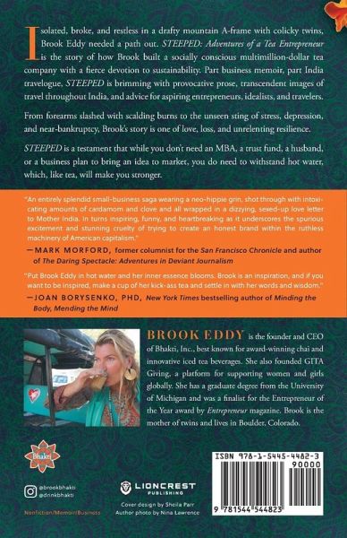 Isolated, broke, and restless in a drafty mountain A-frame with colicky twins, Brook Eddy needed a path out. This is the story of one woman's passionate spirit and how it transformed despair into entrepreneurial success. STEEPED: Adventures Of A Tea Entrepreneur is the story of how Brook built a socially conscious multimillion-dollar tea company with a fierce devotion to sustainability. Part business memoir, part India travelogue, STEEPED is brimming with provocative prose, transcendent images of travel throughout India, and advice for aspiring entrepreneurs, idealists, and travelers. From forearms slashed with scalding burns to the unseen sting of stress, depression, and near bankruptcy, Brook's story is one of love, loss, and unrelenting resilience. STEEPED is a testament that while you don't need an MBA, a trust fund, a husband, or a business plan to bring an idea to market, you do need to be able to withstand hot water, which, like tea, will make you stronger.
