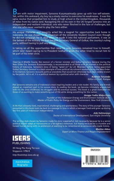 Born with motor impairment, Sarwono Kusumaatmadja grew up with low self-esteem. Yet, within this awkward, shy boy lay a steely resolve to overcome his weaknesses. It was this same resolve that propelled him to study at high school in the United Kingdom, thousands of miles from his native land. Navigating life on his own in the UK forged Sarwono into an independent and resilient individual; one who never flinched in the face of challenges, but also one who never wanted to play the hero either. His unique character and integrity acted like a magnet for opportunities back home in Indonesia. He was chosen to be Chairman of the University Student Council of the Bandung Institute of Technology even though he did not campaign for it. And when he made it into the national parliament, it was at the behest of the military. He then became Secretary General of Golkar, the country's ruling party, without having to pull any strings. In taking on all the opportunities that came his way, Sarwono remained true to himself, which later meant saying no to President Soeharto when the latter tried to recruit him to be part of his inner circle. The book stands as proof that to be intellectual is not merely about education but also enlightenment born out of awareness. In this regard, the book has the potential to cultivate intellectuality and maturity in its readers.