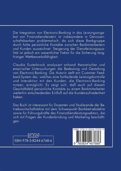 Die Integration von Electronic-Banking in das Leistungsangebot von Finanzdienstleistern ist insbesondere in Genossenschaftsbanken problematisch, da sich diese Bankgruppe durch hohe persönliche Kontakte zwischen Bankmitarbeitern und Kunden auszeichnet. Steigerung der Dienstleistungsqualität ist jedoch ein wesentlicher Faktor für die Sicherung langfristiger Wettbewerbsfähigkeit. Claudia Eusterbrock analysiert anhand theoretischer und empirischer Untersuchungen die Bedeutung und Gestaltung von Electronic-Banking. Die Autorin stellt ein Customer Feedback-System dar, welches eine fortlaufende Leistungskontrolle und Interaktion mit den Kunden, die Electronic-Banking nutzen, ermöglicht. Es zeigt sich, daß auch auf diesem Geschäftsfeld persönliche Kontakte zu einem Bankmitarbeiter weiterhin entscheidenden Einfluß auf die Kundenzufriedenheit haben.