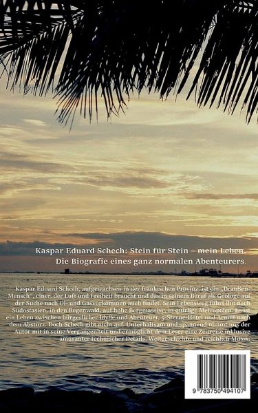 Kaspar Eduard Schech, aufgewachsen in der fränkischen Provinz, ist ein Draußen-Mensch, einer, der Luft und Freiheit braucht und das in seinem Beruf als Geologe auf der Suche nach Erdöl- und Gasvorkommen auch findet. Sein Lebensweg führt ihn nach Südostasien, in den Regenwald, auf hohe Bergmassive, in quirlige Metropolen. Es ist ein Leben zwischen bürgerlicher Idylle und Abenteuer, 5-Sterne-Hotel und Armut nach dem Absturz. Doch Schech gibt nicht auf. Unterhaltsam und spannend nimmt uns der Autor mit in seine Vergangenheit und ermöglicht dem Leser eine Zeitreise inklusive amüsanter technischer Details, Weltgeschichte und reichlich Musik.