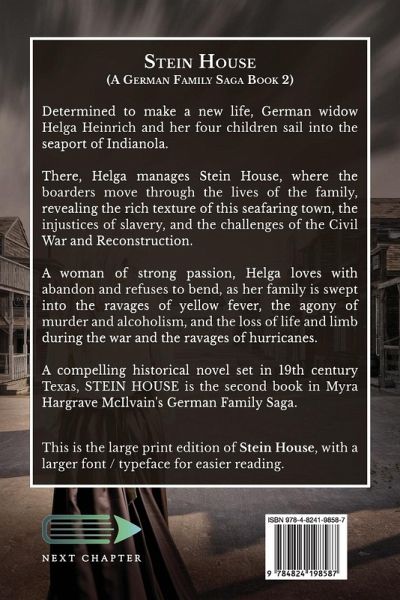 Determined to make a new life, German widow Helga Heinrich and her four children sail into the seaport of Indianola. There, Helga manages Stein House, where the boarders move through the lives of the family, revealing the rich texture of this seafaring town, the injustices of slavery, and the challenges of the Civil War and Reconstruction. A woman of strong passion, Helga loves with abandon and refuses to bend, as her family is swept into the ravages of yellow fever, the agony of murder and alcoholism, and the loss of life and limb during the war and the ravages of hurricanes. A compelling historical novel set in 19th century Texas, STEIN HOUSE is the second book in Myra Hargrave McIlvain's German Family Saga. This is the large print edition of Stein House, with a larger font / typeface for easier reading.