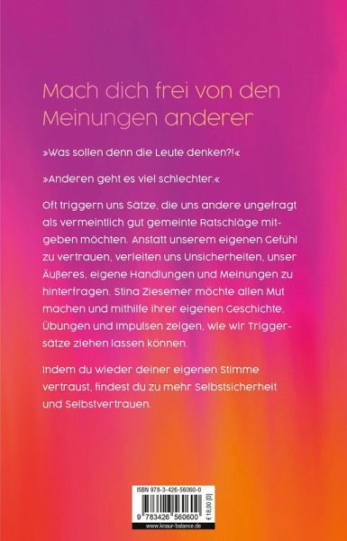 Viele Menschen sehen sich mit den eigenen Triggersätzen konfrontiert, die andere ihnen als vermeintlich gut gemeinte Ratschläge mitgeben. Stina Ziesemer möchte anderen Mut machen, sich nicht mehr verunsichern zu lassen, sondern selbstbestimmt den eigenen Weg zu gehen und Triggersätze ziehen zu lassen.