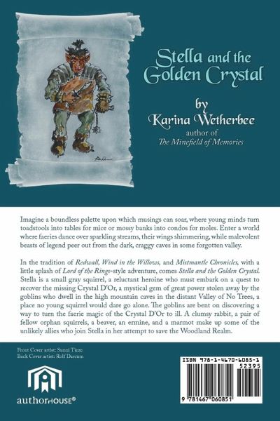 Imagine a boundless palette upon which musings can soar, where young minds turn toadstools into tables for mice or mossy banks into condos for moles. Enter a world where faeries dance over sparkling streams, their wings shimmering, while malevolent beasts of legend peer out from the dark, craggy caves in some forgotten valley. In the tradition of Redwall, Wind in the Willows, and Mistmantle Chronicles, with a little splash of Lord of the Rings-style adventure, comes Stella and the Golden Crystal. Stella is a small gray squirrel, a reluctant heroine who must embark on a quest to recover the missing Crystal D'Or, a mystical gem of great power stolen away by the goblins who dwell in the high mountain caves in the distant Valley of No Trees, a place no young squirrel would dare go alone. The goblins are bent on discovering a way to turn the faerie magic of the Crystal D'Or to ill. A clumsy rabbit, a pair of fellow orphan squirrels, a beaver, an ermine, and a marmot make up some of the unlikely allies who join Stella in her attempt to save the Woodland Realm.