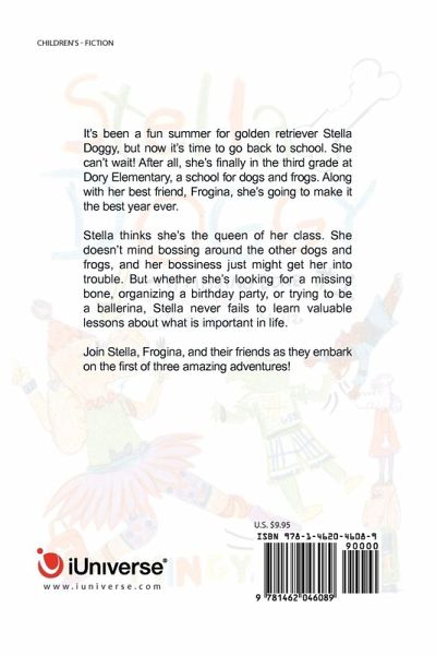 It's been a fun summer for golden retriever Stella Doggy, but now it's time to go back to school. She can't wait! After all, she's finally in the third grade at Dory Elementary, a school for dogs and frogs. Along with her best friend, Frogina, she's going to make it the best year ever. Stella thinks she's the queen of her class. She doesn't mind bossing around the other dogs and frogs, and her bossiness just might get her into trouble. But whether she's looking for a missing bone, organizing a birthday party, or trying to be a ballerina, Stella never fails to learn valuable lessons about what is important in life. Join Stella, Frogina, and their friends as they embark on the first of three amazing adventures!