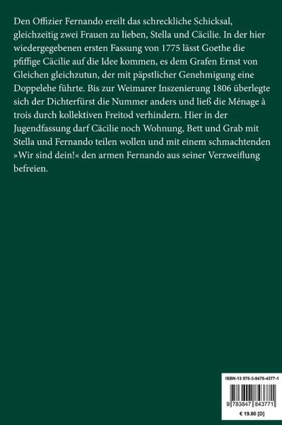 Johann Wolfgang Goethe: Stella. Ein Schauspiel für Liebende Lesefreundlicher Großdruck in 16-pt-Schrift Den Offizier Fernando ereilt das schreckliche Schicksal, gleichzeitig zwei Frauen zu lieben, Stella und Cäcilie. In der hier wiedergegebenen ersten Fassung von 1775 lässt Goethe die pfiffige Cäcilie auf die Idee kommen, es dem Grafen Ernst von Gleichen gleichzutun, der mit päpstlicher Genehmigung eine Doppelehe führte. Bis zur Weimarer Inszenierung 1806 überlegte sich der Dichterfürst die Nummer anders und ließ die Ménage à trois durch kollektiven Freitod verhindern. Hier in der Jugendfassung darf Cäcilie noch Wohnung, Bett und Grab mit Stella und Fernando teilen wollen und mit einem schmachtenden »Wir sind dein!« den armen Fernando aus seiner Verzweiflung befreien. Großformat, 210 x 297 mm Berliner Ausgabe, 2020 Durchgesehener Neusatz mit einer Biographie des Autors bearbeitet und eingerichtet von Theodor Borken Erstdruck: Berlin (Mylius) 1776. Uraufführung am 8.2. 1776 in Hamburg. Textgrundlage ist die Ausgabe: Goethes Werke. Hamburger Ausgabe in 14 Bänden. Textkritisch durchgesehen und mit Anmerkungen versehen von Erich Trunz, Hamburg: Christian Wegener, 1948 ff. Umschlaggestaltung von Thomas Schultz-Overhage unter Verwendung des Bildes: George Romney, Charlotte Bettesworth, 1778. Gesetzt aus der Minion Pro, 16 pt.