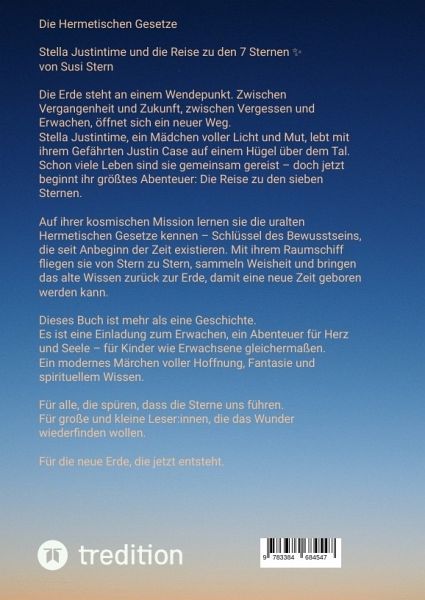 Stella Justintime und die Reise zu den 7 Sternen von Susi SternDie Erde steht an einem Wendepunkt. Zwischen Vergangenheit und Zukunft, zwischen Vergessen und Erwachen, öffnet sich ein neuer Weg.Stella Justintime, ein Mädchen voller Licht und Mut, lebt mit ihrem Gefährten Justin Case auf einem Hügel über dem Tal. Schon viele Leben sind sie gemeinsam gereist - doch jetzt beginnt ihr größtes Abenteuer: Die Reise zu den sieben Sternen.Auf ihrer kosmischen Mission lernen sie die uralten Hermetischen Gesetze kennen - Schlüssel des Bewusstseins, die seit Anbeginn der Zeit existieren. Mit ihrem Raumschiff fliegen sie von Stern zu Stern, sammeln Weisheit und bringen das alte Wissen zurück zur Erde, damit eine neue Zeit geboren werden kann.Dieses Buch ist mehr als eine Geschichte.Es ist eine Einladung zum Erwachen, ein Abenteuer für Herz und Seele - für Kinder wie Erwachsene gleichermaßen.Ein modernes Märchen voller Hoffnung, Fantasie und spirituellem Wissen.Für alle, die spüren, dass dieSterne uns führen.Für große und kleine Leser:innen, die das Wunder wiederfinden wollen.Für die neue Erde, die jetzt entsteht.