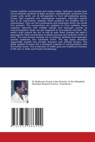 Gravity mediates consciousness and creates matter. Hydrogen cyanide gives rise to prebiotic synthesis of lipids, proteins, carbohydrates, porphyrins and nucleic acids which can all self-assemble to form self-replicating prions, viruses, lipid organisms and carbohydrate organisms. Hydrogen cyanide acts as an interactomic molecule which produces the primitive cell or nanoarchaea. They can form prokaryotes and eukaryotes which can evolve into primates. The nanoarchaea can symbiose to form symbiotic tissue organism networks with metallic cyanide and hydrogen cyanide as neurotransmitters which can get organized to form planets and stars. The earth's orbit around the sun as well as solar flares changes the earth's geomagnetic fields contributing to global warming and evolution of life on earth. The nanoarchaea evolving out of prebiotic synthesis from hydrogen cyanide symbiosed into eukaryotic forms. The egg laying dinosaurs sequentially evolved into primate dinosaurs and primate humans. The stellar galaxies function like a biological organism in communication with the human brains. This is indicative of stellar gods and multifocal evolution of life seen in Vedic and Puranic Astrobiology.