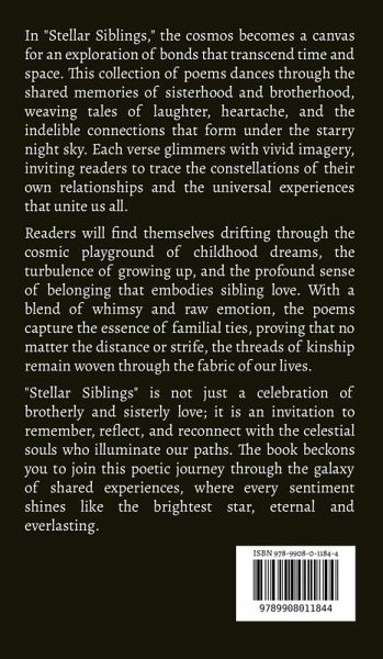 In "Stellar Siblings," the cosmos becomes a canvas for an exploration of bonds that transcend time and space. This collection of poems dances through the shared memories of sisterhood and brotherhood, weaving tales of laughter, heartache, and the indelible connections that form under the starry night sky. Each verse glimmers with vivid imagery, inviting readers to trace the constellations of their own relationships and the universal experiences that unite us all. Readers will find themselves drifting through the cosmic playground of childhood dreams, the turbulence of growing up, and the profound sense of belonging that embodies sibling love. With a blend of whimsy and raw emotion, the poems capture the essence of familial ties, proving that no matter the distance or strife, the threads of kinship remain woven through the fabric of our lives. "Stellar Siblings" is not just a celebration of brotherly and sisterly love; it is an invitation to remember, reflect, and reconnect with the celestial souls who illuminate our paths. The book beckons you to join this poetic journey through the galaxy of shared experiences, where every sentiment shines like the brightest star, eternal and everlasting.
