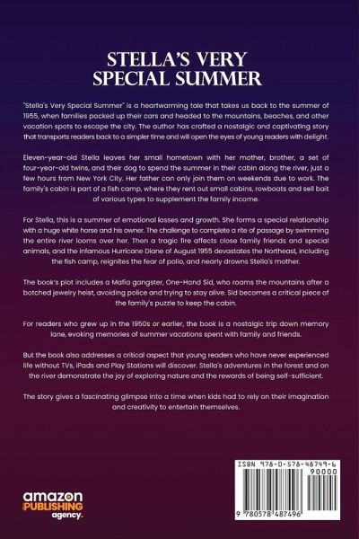 "Stella's Very Special Summer" is a heartwarming tale that takes us back to the summer of 1955, when families packed up their cars and headed to the mountains, beaches, and other vacation spots to escape the city. The author has crafted a nostalgic and captivating story that transports readers back to a simpler time and will open the eyes of young readers with delight. Eleven-year-old Stella leaves her small hometown with her mother, brother, a set of four-year-old twins, and their dog to spend the summer in their cabin along the river, just a few hours from New York City. Her father can only join them on weekends due to work. The family's cabin is part of a fish camp, where they rent out small cabins, rowboats and sell bait of various types to supplement the family income. For Stella, this is a summer of emotional losses and growth. She forms a special relationship with a huge white horse and his owner. The challenge to complete a rite of passage by swimming the entire river looms over her. Then a tragic fire affects close family friends and special animals, and the infamous Hurricane Diane of August 1955 devastates the Northeast, including the fish camp, reignites the fear of polio, and nearly drowns Stella's mother. The book's plot includes a Mafia gangster, One-Hand Sid, who roams the mountains after a botched jewelry heist, avoiding police and trying to stay alive. Sid becomes a critical piece of the family's puzzle to keep the cabin. For readers who grew up in the 1950s or earlier, the book is a nostalgic trip down memory lane, evoking memories of summer vacations spent with family and friends. But the book also addresses a critical aspect that young readers who have never experienced life without TVs, iPads and Play Stations will discover. Stella's adventures in the forest and on the river demonstrate the joy of exploring nature and the rewards of being self-sufficient. The story gives a fascinating glimpse into a time when kids had to rely on their imagination and creativity to entertain themselves.