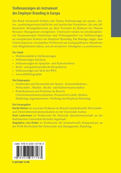 Der Band versammelt Studien zum Thema Stellenanzeige aus sprach-, kultur-, marketingwissenschaftlicher und juristischer Perspektive, die eine differenzierte Herangehensweise an diese Textsorte im Rahmen des Human Resource Management ermöglichen. Untersucht werden im interdisziplinären Zusammenspiel Funktionen und Wirkungsmittel von Stellenanzeigen im europäischen Kontext des Employer Branding. Die Beiträge zeigen, dass Unternehmen im verschärften Wettbewerb um hochqualifizierte Mitarbeiter viele Möglichkeiten haben, sich als attraktiver Arbeitgeber zu positionieren.
