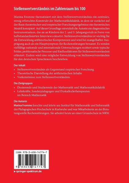 Marina Fromme thematisiert mit dem Stellenwertverständnis ein zentrales, wenig erforschtes Konstrukt der Mathematikdidaktik, in dem sie zunächst auf der Basis theoretischer und empirischer Forschungsergebnisse ein theoretisches Modell konzipiert. Auf dieser Grundlage entwickelt die Autorin ein diagnostisches Instrumentarium, das sie an Kindern der 2. und 3. Jahrgangsstufe in Form von halbstandardisierten Interviews einsetzt. Stellenwertverständnis ist wichtig für die Entwicklung arithmetischer Kompetenzen und wird bei mangelhafter Ausprägung auch als ein Hauptsymptom für Rechenstörungen benannt. Es werden vielfältige nationale und internationale Untersuchungen rezitiert sowie typische Fehler, problematische Prozesse und Einflussfaktoren für Stellenwertverständnis erläutert. Zudem wird eine mögliche Entwicklung von Stellenwertverständnis für den deutschen Sprachraum beschrieben.