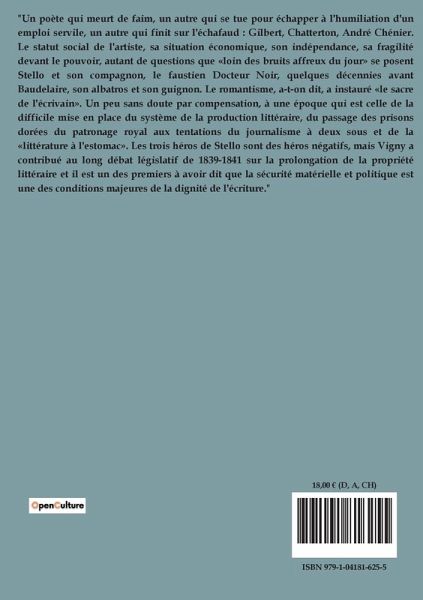 "Stello" d'Alfred de Vigny est une uvre qui explore les affres de l'âme poétique face aux réalités cruelles de la société. Le récit s'ouvre sur le personnage de Stello, un poète en proie à une mélancolie transitoire, malgré une vie apparemment bénie par la chance. Il est visité par le Docteur-Noir, un personnage énigmatique qui lui raconte des histoires pour le détourner de ses idées noires. À travers ces récits, le Docteur-Noir illustre les dangers auxquels s'exposent les poètes lorsqu'ils s'engagent dans des causes politiques ou sociales. L'une des histoires les plus marquantes est celle de Gilbert, un poète mort dans la misère, trahi par la société qu'il a tenté de servir. Le Docteur-Noir met en garde Stello contre l'illusion de la gloire littéraire et les pièges du changement politique, soulignant que la société est souvent ingrate envers ceux qui cherchent à l'éclairer. Le récit se termine sur une note sombre, avec la mort de Gilbert, symbolisant le destin tragique des poètes incompris et négligés. À travers "Stello", Vigny offre une réflexion sur la condition du poète, tiraillé entre son idéal et la réalité, et sur la solitude inhérente à la quête de vérité et de beauté.