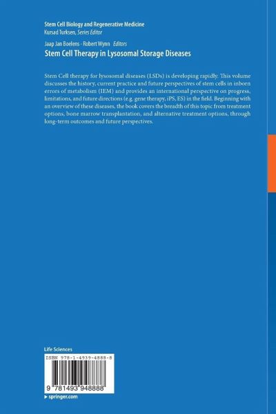 1. Lysosomal Diseases and Therapeutic Options: An Overview.- 2. Alternative Treatment Options: Enzyme Replacement and Small Molecule Therapies.- 3. Hematopoietic Cell Transplantation in Inborn Errors of Metabolism.- 4. Allogeneic Hematopoietic Stem Cell Transplantation in Lysosomal Storage Disorders: Long Term Neurodevelopmental and Somatic Outcome.- 5. Hematopoietic Stem Cell Gene Therapy for Lysosomal Storage Disorders: Expected Benefits and Limitations.- 6. Alternative Future Therapies for Lysosomal Storage Diseases: Embryonic Stem Cell- and Induced Pluripotent Stem Cell Therapy.- 7. New Directions and Conclusions.