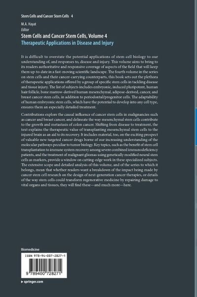Vast therapeutic applications of the following specific stem cells in disease and tissue injury are discussed: embryonic stem cells, induced pluripotent stem cells, human hair follicle stem cells, bone marrow-derived human mesenchymal stem cells, adipose-derived stem cells, periodontal/progenitor cells, cancer stem cells, and breast cancer stem cells. Because human embryonic stem cells possess the potential to produce unlimited quantities of any human cell type, considerable focus is placed on this type of stem cells in this volume. The role of cancer stem cells, specifically in breast cancer is explained. Transplantation of mesenchymal stem cells to aid the injured brain is included. Immune recovery after stem cells transplantation in severe combined immunodeficiency patients is described. The role of mesenchymal stem cells in enhancing the growth and metastasis of colon cancer is discussed. Clinical application of human follicle stem cells is presented. Treatment of malignant gliomas using genetically-modified neural stem cells as a marker is discussed. The impact of cancer stem cell hypothesis on designing new cancer therapies is explained. In the field of regenerative medicine, the use of stem cells in the repair of the central nervous system, tendon injury, and as a cardiac regenerative medicine is described. The role of DNA methylation in maintaining stemness induced pluripotent stem cells from human extraembryonic amnion cells is discussed. Insights on the understanding of molecular pathways involved in tumor biology are explained, which lead to the development of effective drugs. Information on pathways, such as hedgehog, facilitates targeted therapies in cancer.