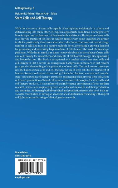 With the discovery of stem cells capable of multiplying indefinitely in culture and differentiating into many other cell types in appropriate conditions, new hopes were born in repair and replacement of damaged cells and tissues. The features of stem cells may provide treatment for some incurable diseases with some therapies are already in clinics, particularly those from adult stem cells. Some treatments will require large number of cells and may also require multiple doses, generating a growing demand for generating and processing large numbers of cells to meet the need of clinical applications. With this in mind, our aim is to provide a book on the subject of stem cells and cell therapy for researchers and students of cell biotechnology, bioengineering and bioproduction. This book is exceptional as it teaches researchers stem cells and cell therapy in that it covers the concepts and backgrounds necessary so that readers get a good understanding of the production of stem cells. The book covers three topics: The basics of stem cells and cell therapy, the use of stem cells for the treatment of human diseases, and stem cell processing. It includes chapters on neural and vascular stem vascular stem cell therapy, expansion engineering of embryonic stem cells, stem cell based production of blood cells and separation technologies for stem cells and cell therapy products. It is an informed and informative presentation of what modern research, science and engineering have learned about stem cells and their production and therapies. Addressing both the medical and production issues, this book is an invaluable contribution to having an academic and industrial understanding with respect to R&D and manufacturing of clinical grade stem cells.