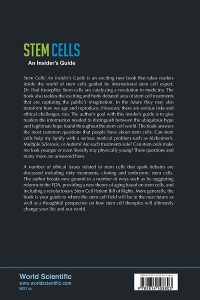This exciting new book takes readers inside the world of stem cells guided by the author, Dr. Paul Knoepfler, who is an international expert in stem cells. Stem cells are catalyzing a revolution in medicine and may transform how we age. The author's goal is to give readers an insider's guide into the world of stem cells. The book answers the most common questions that people have about stem cells and stem cell treatments. What are stem cells? Why are some types controversial? Can stem cells help my family with a serious medical problem such as Alzheimer's or Autism? Are such treatments safe? Can stem cells make me stay young? These questions and many more equally important ones are answered in this book in a manner that the reader can enjoy and understand. Stem Cells: An Insider's Guide also takes readers inside a stem cell lab with an exciting virtual tour. In addition, it provides a description of a day in the life of a prototypic stem cell to give readers an inside look at how they function and the key factors that influence them. In these ways, the author brings readers fully up to speed on the cutting-edge rapidly moving field of stem cells. The book is unique as it is written in an approachable, often humorous way that a general, educated audience can understand and appreciate. A number of issues related to stem cells that spark controversies are also discussed. The book also tackles the exciting, but fast moving areas of stem cell treatments including sports medicine, anti-aging and cosmetics that are capturing the public's imagination. Are these treatments ready for prime time? The book cuts through the hype and answers that essential question. It is also your guide to where the stem cell field will be in the near future and how it could change your life and our world.
