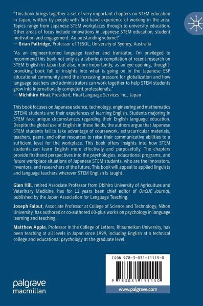 Foreword (Laurence Anthony).- Chapter 1: Introduction (Glen Hill).- Part I: English for Japanese STEM Workplaces.- Chapter 2: Vertical Vs. Horizontal Oral Discourses in Japanese Healthcare Professions (Mike Guest).- Chapter 3: Corporate Views of English Used in Agricultural Companies (Glen Hill).- Part II: English for Japanese STEM Education.- Chapter 4: Motivation to Study English in Japan: A Nationwide Investigation of Japanese STEM Students (Matthew Apple, Joseph Falout and Glen Hill).- Chapter 5: Development and Implementation of an English for Research Purposes Program for Japanese and International Graduate Students of Science, Technology and Engineering (Bill Holden and John Blake).- Chapter 6: Genre-Based, Corpus-Supported Writing Programs for Science and Engineering Students at Japanese Universities (Judy Noguchi and Nilson Kunioshi).- Part III: English for Japanese STEM Students.- Chapter 7: Perceptions of English Needs at a National University:Comparing Students and Science Teachers (Glen Hill).- Chapter 8: The Effects of Career Education Exercises on L2 Motivation in English Classes (Noriko Iwamoto).- Chapter 9: To Build a Poster: The Story of a STEM Poster Presentation Course (Madoka Kawano, James Elwood and Reijiro Shibasaki).- Chapter 10: EFL STEM Students' Variable Identities for Learning English Writing as Shared Repertoire (Kimie Yamamura).- Part IV: Aligning Motivations, Values and Practices.- Chapter 11: Possible L2 Selves of STEM Graduate Students: A Two-Year Interview Study (Matthew Apple, Joseph Falout and Glen Hill).- Chapter 12: L2 Learning Motivations and Prosocial Engagement in EFL Conversation Classes: A Comparison of STEM and Humanities Students (Yoshifumi Fukada, Tim Murphey, Tetsuya Fukuda and Joseph Falout).- Chapter 13: Developing Courses and Preparing Materials with Focus on Weaknesses of Japanese Engineers and Engineering Students (Michihiro Hirai).- Chapter 14: STEM (And English) In Japan: The Big Picture (Matthew Apple, Joseph Falout and Glen Hill).