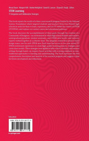 This book reports the results of a three-year research program funded by the National Science Foundation which targeted students and teachers from four Detroit high schools in order for them to learn, experience, and use IT within the context of STEM (IT/STEM), and explore 21st century career and educational pathways. The book discusses the accomplishment of these goals through the creation of a Community of Designers-- an environment in which high school students and teachers, undergraduate/graduate student assistants, and STEM area faculty and industry experts worked together as a…mehr