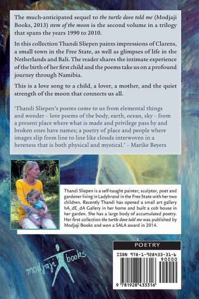 The much-anticipated sequel to the turtle dove told me (Modjaji Books, 2013), which won a SALA Award in 2014, stem of the moon is the second volume in a trilogy that spans the years 1990 - 2010. In this collection, Sliepen paints impressions of a small town, Clarens in the Free State, as well as glimpses of life in the Netherlands and Bali. The reader shares the intimate experience of the birth of her first child and the poems take us on a profound journey through Namibia. Sliepen's latest collection is a love song to a child, a lover, a mother, and the quiet strength of the moon that connects us all.