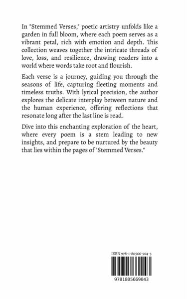 In "Stemmed Verses," poetic artistry unfolds like a garden in full bloom, where each poem serves as a vibrant petal, rich with emotion and depth. This collection weaves together the intricate threads of love, loss, and resilience, drawing readers into a world where words take root and flourish. Each verse is a journey, guiding you through the seasons of life, capturing fleeting moments and timeless truths. With lyrical precision, the author explores the delicate interplay between nature and the human experience, offering reflections that resonate long after the last line is read. Dive into this enchanting exploration of the heart, where every poem is a stem leading to new insights, and prepare to be nurtured by the beauty that lies within the pages of "Stemmed Verses."