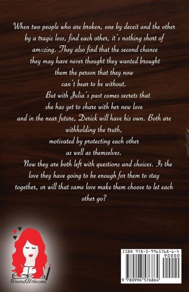 When two people who are broken, one by deceit and the other by a tragic loss, find each other, it’s nothing short of amazing. They also find that the second chance they may have never thought they wanted brought them the person that they now can’t bear to be without. But with Julia’s past comes secrets that she has yet to share with her new love and in the near future, Derick will have his own. Both are withholding the truth, motivated by protecting each other as well as themselves. Now they are both left with questions and choices. Is the love they have going to be enough for them to stay together, or will that same love make them choose to let each other go?