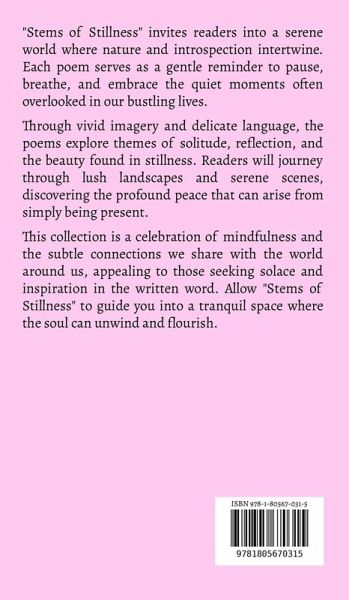 "Stems of Stillness" invites readers into a serene world where nature and introspection intertwine. Each poem serves as a gentle reminder to pause, breathe, and embrace the quiet moments often overlooked in our bustling lives. Through vivid imagery and delicate language, the poems explore themes of solitude, reflection, and the beauty found in stillness. Readers will journey through lush landscapes and serene scenes, discovering the profound peace that can arise from simply being present. This collection is a celebration of mindfulness and the subtle connections we share with the world around us, appealing to those seeking solace and inspiration in the written word. Allow "Stems of Stillness" to guide you into a tranquil space where the soul can unwind and flourish.