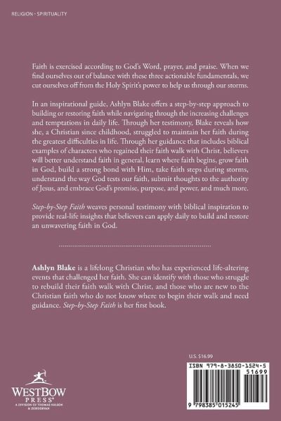 Faith is exercised according to God's Word, prayer, and praise. When we find ourselves out of balance with these three actionable fundamentals, we cut ourselves off from the Holy Spirit's power to help us through our storms. In an inspirational guide, Ashlyn Blake offers a step-by-step approach to building or restoring faith while navigating through the increasing challenges and temptations in daily life. Through her testimony, Blake reveals how she, a Christian since childhood, struggled to maintain her faith during the greatest difficulties in life. Through her guidance that includes biblical examples of characters who regained their faith walk with Christ, believers will better understand faith in general, learn where faith begins, grow faith in God, build a strong bond with Him, take faith steps during storms, understand the way God tests our faith, submit thoughts to the authority of Jesus, and embrace God's promise, purpose, and power, and much more. Step-by-Step Faith weaves personal testimony with biblical inspiration to provide real-life insights that believers can apply daily to build and restore an unwavering faith in God.