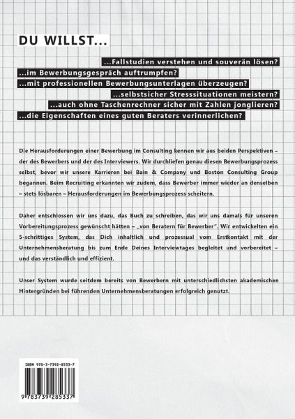 "Step by Step ins Consulting - Von Beratern für Bewerber" ist das neue Vorbereitungsbuch für Bewerbungen bei Unternehmensberatungen, das Dir Schritt für Schritt in einfacher und effizienter Form alles vermittelt, was Du für eine erfolgreiche Bewerbung benötigst! Was erwartet Dich in "Step by Step ins Consulting - Von Beratern für Bewerber"?5-schrittiges System, das Dich den kompletten Prozess Deiner Bewerbung vorbereitet und begleitet - vom Thema Bewerbungsunterlagen über Anforderungen im Persönlichkeitsinterview, 100 Seiten über Fallstudien bis zum InterviewtagHervorhebung wichtiger Schritte der Bewerbung, die in vielen Ratgebern nicht behandelt werden, wie z. B. das Persönlichkeitsinterviews oder Tipps zur PräsentationKeine Vermittlung nicht mehr zeitgemäßer, starrer Konzepte und akademischer Übungen wie z. B. Frameworks zum Auswendiglernen! Stattdessen erfährst Du Grundprinzipien und Strukturhilfen, die Du für jede Fallstudie nutzen kannst Für wen ist "Step by Step ins Consulting - Von Beratern für Bewerber" geeignet?Ob McKinsey, BCG oder Bain & Company, ob Goldman Sachs, J.P. Morgan oder Morgan Stanley, ob KKR, Carlyle oder Bain Capital - Du hast immer das passende System zur Vorbereitung an der HandDas Buch ist für Studenten und Young Professionals geeignet, unabhängig vom akademischen Hintergrund, da es explizit auf Deinen persönlichen Fähigkeiten aufsetzt und es alle inhaltlichen Konzepte ausführlich beschreibt und gleichzeitig in den Kontext der täglichen Arbeit eines Unternehmensberaters setzt Von wem stammt "Step by Step ins Consulting - Von Beratern für Bewerber"?Philipp Grüner und Jakob Schoroth kennen die Herausforderungen einer Bewerbung im Consulting aus beiden Perspektiven - der des Bewerbers und der des InterviewersBeide durchliefen die Bewerbungsprozesse für Unternehmensberatungen (Angebote von vier internationalen Top-Strategieberatungen) und Investment-Banken (Angebote von zwei amerikanischen Bulge Bracket Banks) selbst, bevor sie Ihre Karrieren begannen Du willst...... Fallstudien verstehen und souverän lösen? "Step by Step ins Consulting" beschreibt lösungsorientiert eine Vielzahl von Case Arten, anstelle Dir nicht mehr zeitgemäße Frameworks zum Auswendiglernen an die Hand zu geben. ... im Bewerbungsgespräch auftrumpfen? "Step by Step ins Consulting" zeigt Dir ganz genau, wie Du Dich im Bewerbungsgespräch optimal verkaufst. ... mit professionellen Bewerbungsunterlagen überzeugen? "Step by Step ins Consulting" geht aus der Sicht einer Recruitingabteilung auf jeden Aspekt Deiner Bewerbungsunterlagen ein und zeigt Dir vielfach erprobte Beispiele. ...selbstsicher Stresssituationen meistern? "Step by Step ins Consulting" gibt Dir Tipps, wie Du am Tag Deiner Bewerbungsgespräche durch die richtige Einstellung und praktische Tipps einen klaren Kopf behältst. ... auch ohne Taschenrechner sicher mit Zahlen jonglieren? "Step by Step ins Consulting" zeigt Dir einfache Methoden, wie Du auch mit großen Zahlen schnell undsicher rechnen kannst. ... die Eigenschaften eines guten Beraters verinnerlichen? "Step by Step ins Consulting" leitet die Anforderungen des Bewerbungsgespräches aus dem Alltag des Beraters und der Sicht des Interviewers her.