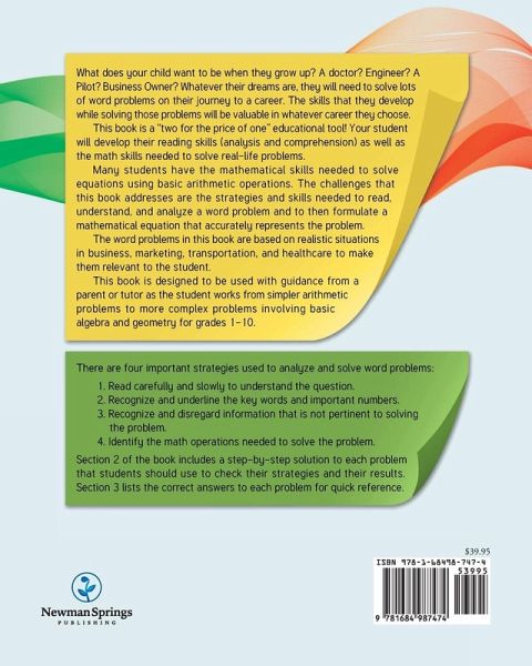 What does your child want to be when they grow up? A doctor? Engineer? A Pilot? Business Owner? Whatever their dreams are, they will need to solve lots of word problems on their journey to a career. The skills that they develop while solving those problems will be valuable in whatever career they choose. This book is a "two for the price of one" educational tool! Your student will develop their reading skills (analysis and comprehension) as well as the math skills needed to solve real-life problems. Many students have the mathematical skills needed to solve equations using basic arithmetic operations. The challenges that this book addresses are the strategies and skills needed to read, understand, and analyze a word problem and to then formulate a mathematical equation that accurately represents the problem. The word problems in this book are based on realistic situations in business, marketing, transportation, and healthcare to make them relevant to the student. This book is designed to be used with guidance from a parent or tutor as the student works from simpler arithmetic problems to more complex problems involving basic algebra and geometry for grades 1-10. There are four important strategies used to analyze and solve word problems: 1. Read carefully and slowly to understand the question. 2. Recognize and underline the key words and important numbers. 3. Recognize and disregard information that is not pertinent to solving the problem. 4. Identify the math operations needed to solve the problem. Section 2 of the book includes a step-by-step solution to each problem that students should use to check their strategies and their results. Section 3 lists the correct answers to each problem for quick reference.
