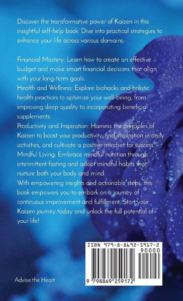 Discover the transformative power of Kaizen in this insightful self-help book. Dive into practical strategies to enhance your life across various domains:Financial Mastery: Learn how to create an effective budget and make smart financial decisions that align with your long-term goals. Health and Wellness: Explore biohacks and holistic health practices to optimize your well-being, from improving sleep quality to incorporating beneficial supplements. Productivity and Inspiration: Harness the principles of Kaizen to boost your productivity, find inspiration in daily activities, and cultivate a positive mindset for success. Mindful Living: Embrace mindful nutrition through intermittent fasting and adopt mindful habits that nurture both your body and mind. With empowering insights and actionable steps, this book empowers you to embark on a journey of continuous improvement and fulfillment. Start your Kaizen journey today and unlock the full potential of your life!