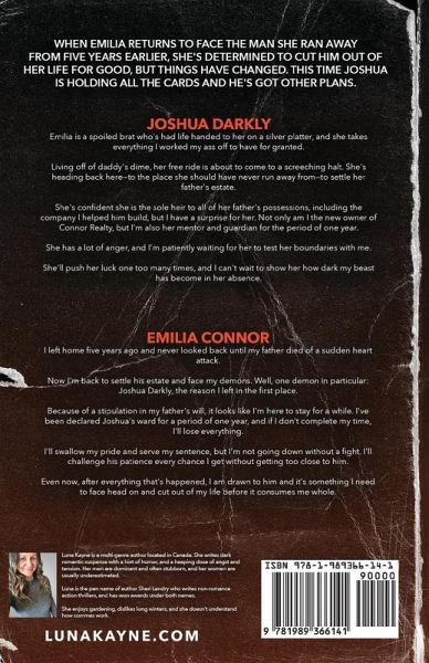 When Emilia Connor returns to face the man she ran away from five years earlier, she's determined to cut him out of her life for good but things have changed. This time Joshua Darkly is holding all of the cards and he's got other plans. JOSHUA DARKLYEmilia is a spoiled brat who's had life handed to her on a silver platter and she takes everything I worked hard to earn for granted. Living off of daddy's dime, her free ride is about to come to a screeching halt. She's heading back here, to the place she should have never run away from, to settle her father's estate. She's confident she is the sole heir to all of her father's possessions, including the company I worked my ass off to help build over the last seven years, but I have a surprise for her. Not only am I the new owner of Connor Realty, but I'm also her mentor and guardian for the period of one year. I never asked to own her but now that I do, I'm not sure I can ever let her go. She's feisty, she has a lot of anger in her and I'm patiently waiting for her to test her boundaries with me. She'll try her luck one too many times and I can't wait to show her how dark my beast has become. EMILIA CONNOROur past always has a way of catching up to us. I left home five years ago and never looked back. I always thought I had more time to make amends with my father and come home but my time ran out when he died of a sudden heart attack. Now I'm back to settle his estate and face my demons. Well, one demon in particular; Joshua Darkly, the reason I left in the first place. Because of a stipulation in my father's will, it looks like I'm here to stay for awhile. I've been declared Joshua's ward for a period of one year and if I don't complete my time, I'll lose everything. I'll swallow my pride and serve my sentence but I'm not going down without a fight. I'll challenge his patience every chance I get without getting too close to him. Even now, after everything, I still feel drawn to him and it's something I need to face head on and cut out of my life before it consumes me whole.
