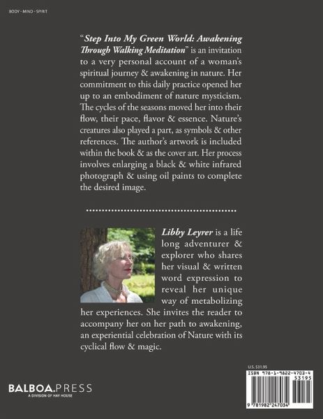"Step Into My Green World: Awakening Through Walking Meditation" is an invitation to a very personal account of a woman's spiritual journey & awakening in nature. Her commitment to this daily practice opened her up to an embodiment of nature mysticism. The cycles of the seasons moved her into their flow, their pace, flavor & essence. Nature's creatures also played a part, as symbols & other references. The author's artwork is included within the book & as the cover art. Her process involves enlarging a black & white infrared photograph & using oil paints to complete the desired image.
