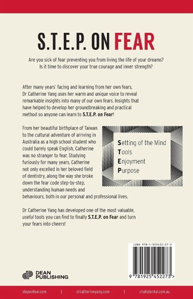 Are you sick of fear preventing you from living the life of your dreams?Is it time to discover your true courage and inner strength? After many years' facing and learning from her own fears, Dr. Catherine Yang uses her warm and unique voice to reveal remarkable insights into many of our own fears. Insights that have helped to develop her groundbreaking and practical method so anyone can learn to S.T.E.P. on Fear! Setting of the Mind Tools Enjoyment Purpose From her beautiful birthplace of Taiwan to the cultural adventure of arriving in Australia as a high school student who could barely speak English, Catherine was no stranger to fear. Studying furiously for many years, Catherine not only excelled in her beloved field of dentistry, along the way she broke down the fear code step-by-step, understanding human needs and behaviours, both in our personal and professional lives. Dr Catherine Yang has developed one of the most valuable, useful tools you can find to finally S.T.E.P. on Fear and turn your fears into cheers!