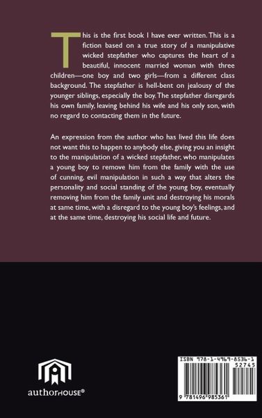 This is the first book I have ever written. This is a fiction based on a true story of a manipulative wicked stepfather who captures the heart of a beautiful, innocent married woman with three children-one boy and two girls-from a different class background. The stepfather is hell-bent on jealousy of the younger siblings, especially the boy. The stepfather disregards his own family, leaving behind his wife and his only son, with no regard to contacting them in the future. An expression from the author who has lived this life does not want this to happen to anybody else, giving you an insight to the manipulation of a wicked stepfather, who manipulates a young boy to remove him from the family with the use of cunning, evil manipulation in such a way that alters the personality and social standing of the young boy, eventually removing him from the family unit and destroying his morals at same time, with a disregard to the young boy's feelings, and at the same time, destroying his social life and future.