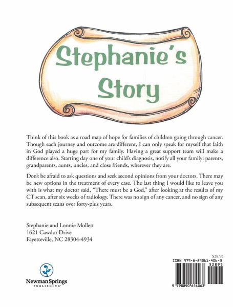 Think of this book as a road map of hope for families of children going through cancer. Though each journey and outcome are different, I can only speak for myself that faith in God played a huge part for my family. Having a great support team will make a difference also. Starting day one of your child's diagnosis, notify all your family: parents, grandparents, aunts, uncles, and close friends, wherever they are. Don't be afraid to ask questions and seek second opinions from your doctors. There may be new options in the treatment of every case. The last thing I would like to leave you with is what my doctor said, "There must be a God," after looking at the results of my CT scan, after six weeks of radiology. There was no sign of any cancer, and no sign of any subsequent scans over forty-plus years. Stephanie and Lonnie Mollett 1621 Cawdor Drive Fayetteville, NC 28304-4934