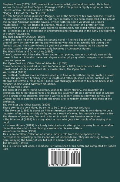 Stephen Crane (1871-1900) was an American novelist, poet and journalist. He is best known for his novel Red Badge of Courage (1895). His prose is highly original, a mix of impressionism, naturalism and symbolism. Maggie: A Girl of the Streets (1893) In 1892 Stephen Crane published Maggie, Girl of the Streets at his own expense. It was a failure, considered to be immature. But more recently it has been considered to be one of the earliest American realistic novels, written with the same vividness as Crane's masterpiece - The Red Badge of Courage. Maggie is the story of a pretty girl who "blossomed in a mud puddle", was driven to prostitution, and killed herself while she was still a teenager. It is a milestone in uncompromising realism and in the early development of literary naturalism. The Red Badge of Courage (1895) Crane was then inspired to write his second novel - The Red Badge of Courage. He was tired of dryly written war stories and wondered what the men actually felt during the famous battles. The story follows 18 year old private Henry Fleming as he battles to survive, copes with guilt and eventually becomes a courageous fighter. The Black Riders and Other Lines (1895) Crane's poetry, which he called 'lines' rather than poems, was as strickingly new as his prose. It has a minimalist meter and rhyme and employs symbolic imagery to articulate irony and paradox. The Open Boat and Other Tales of Adventure (1898) Crane became shipwrecked in route to Cuba in early 1897, an experience which he transformed into his vivid short story masterpiece, The Open Boat. War is Kind (1899) War is Kind, contains more of Crane's poetry, in free verse without rhyme, meter, or even titles. The poems are typically short in length and although some poems, such as use stanzas and refrains, most do not. Crane was strikingly different to his peers because he allegory, dialectic and narrative situations. Active Service (1899) The hero of the story, Rufus Coleman, wishes to marry Marjory, the daughter of a professor. The father disapproves and drags his daughter off on a summer tour of Greece with a group of his students, only for a war to suddenly break out between Turkey and Greece. Rufus is determined to safe the group and to redeem himself in the eyes of the professor. The Monster and Other Stories (1899) These stories are considered by some to be Crane's greatest writings: - The Monster (1898) is about an African-American coachman who is considered to be a 'monster' after being horribly disfigured as a result of saving his master's son from a fire. The themes of prejudice, fear and isolation in small town America are explored. - The Blue Hotel (1898) is a story about a man who gets into trouble after staying at a hotel. - His New Mittens (1899) is a lovely tale of a boy's attempt to run away from home after his mother stops him from playing snowballs in his new mittens. Wounds in the Rain (1900) This is an excellent collection of stories, mostly told from the perspective of a correspondent reporting on the Cuban war of independence. They are moving, funny, and grim, relaying the horror of war but not in a heavy-handed way. The O'Ruddy (1903) This is Crane's final work, a romance, left unfinished at his death and completed by Robert Barr.