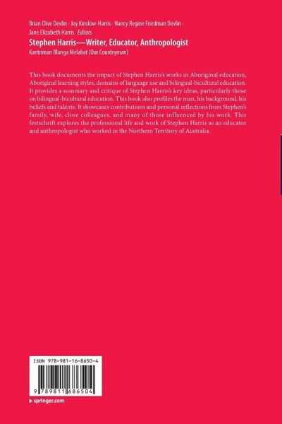 Introduction.- PART A.- 1 An overview of the life of Stephen Harris.- 2 From start to finish: a man of many parts .- 3 Nomo munanga; main kantrimen ('Not a White person, but one belonging to my land and my people').- 4 Language and belonging: the gift of a childhood with Aboriginal people.- 5 Stephen Harris: heritage and legacy .- 6 Some personal and professional reminiscences .- PART B.- 7 Our professional collaboration over the years.- 8 An exchange of correspondence focused on the interdependence hypothesis.- 9 My professional recollections .- 10 Different roles, similar goals: Devlin & Harris, 1978-2020 .- 11 Opening the door to a new understanding of Aboriginal learning styles.- 12 Stephen as a mentor, colleague and friend..- 13 Memories of a friend and colleague.- 14 Reminiscences from an Aboriginal scholar and former student.- 15 Still ahead of his time.- 16 Stephen Harris and the domain separation debate.- 17 An exploration of some issues.- PART C.- 18 A brief history of linguistics in the Northern Territory.- 19 A letter to school staff in the north-west of South Australia.- 20 Carving out domains for the use of a re-awakening language.- 21 A poetic tribute.- 22 Bibliography of Stephen Harris's published and unpublished work.- Index.