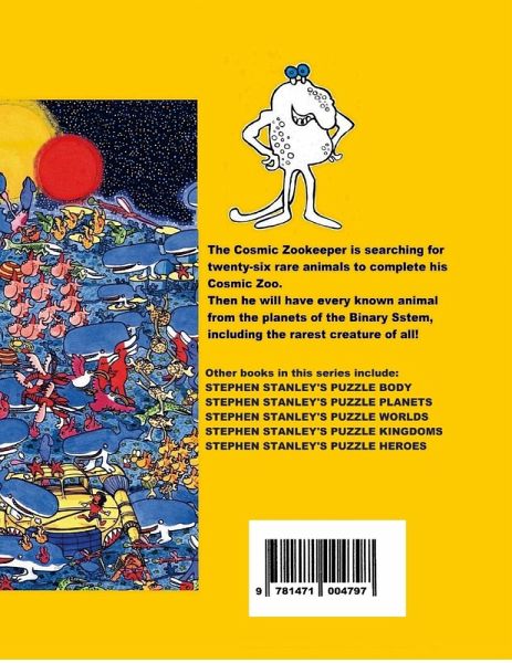 The Cosmic Zookeeper is searching for twenty-six rare creatures to complete his Cosmic Zoo. Then he will have every known animal from the planets of the Binary System, including the rarest creature of all. Captain Zedess and the crew of the Z Ship arrive to locate the animals, while the Animal Freedom League work to thwart their plans. Are you ready for a wild adventure to the frozen world of Iceball? Or perhaps Bonedry- a planet where the oceans have dried up and left the fish walking about on legs? This is yet another amazing picture puzzle book by Stephen Stanley, with this version also having six extra pages of solutions artwork to help you find the literally hundreds of different animals to be discovered,