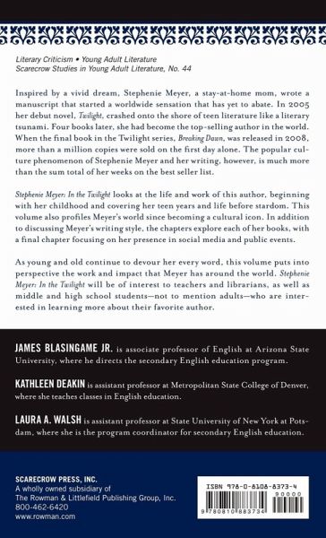 Stephenie Meyer: In the Twilight looks at the life and work of this author, beginning with her childhood and covering her teen years and life before stardom. This volume also profiles Meyer's world since becoming a cultural icon. In addition, chapters discuss Meyer's writing style and explore each of her books, with a final chapter focusing on her presence in social media and public events.