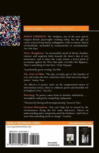 Four plays inspired by and originating on the European stage from one of Britain's most important playwrights. Three Kingdoms was presented at Teater NO99 in Tallinn, Estonia on 17 September 2011, before opening at the Munich Kammerspiele, Germany, on 15 October 2011. 'An inconsolable mood of dread, abandon, violence and suspicion lurks beneath the show's skin of arty insouciance, and at times the script attains a lyrical pitch of accusation against the West that quite overrides the flippancy. There's something of value here.' Daily Telegraph; The Trial of Ubu premiered at the Schauspielhaus Essen in a co-production with the Toneelgroep Amsterdam. 'The play certainly gets at the banality of evil, and evokes the slow, sometimes dull, often uncertain slog of justice.' Sunday Times. Subtitled 'A Play For Young People', Morning was developed in partnership between the Lyric Hammersmith, London, and the Junges Theater, Göttingen. The Financial Times described it as 'theatrically daring and uncompromising'; Carmen Disruption, a reimagining of Bizet's opera, premiered at the Deutsche Spielhaus in spring, 2014, before its UK premiere at the Almeida, London, in April 2015. 'You can't help but be moved by the circumstances facing the five main characters. There's an understanding and a compassion amid the bleakness. And a fierce sense that something needs to change.' Guardian;