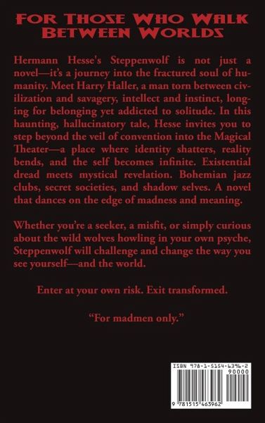 For Those Who Walk Between Worlds Hermann Hesse's Steppenwolf is not just a novel-it's a journey into the fractured soul of humanity. Meet Harry Haller, a man torn between civilization and savagery, intellect and instinct, longing for belonging yet addicted to solitude. In this haunting, hallucinatory tale, Hesse invites you to step beyond the veil of convention into the Magical Theater-a place where identity shatters, reality bends, and the self becomes infinite. Existential dread meets mystical revelation. Bohemian jazz clubs, secret societies, and shadow selves. A novel that dances on the edge of madness and meaning. Whether you're a seeker, a misfit, or simply curious about the wild wolves howling in your own psyche, Steppenwolf will challenge and change the way you see yourself-and the world. Enter at your own risk. Exit transformed. "For madmen only."