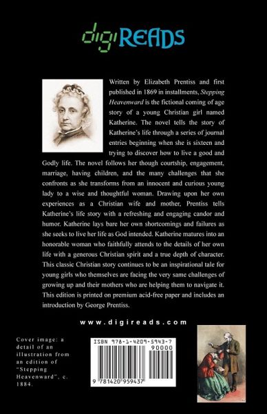 Written by Elizabeth Prentiss and first published in 1869 in installments, "Stepping Heavenward" is the fictional coming of age story of a young Christian girl named Katherine. The novel tells the story of Katherine's life through a series of journal entries beginning when she is sixteen and trying to discover how to live a good and Godly life. The novel follows her though courtship, engagement, marriage, having children, and the many challenges that she confronts as she transforms from an innocent and curious young lady to a wise and thoughtful woman. Drawing upon her own experiences as a Christian wife and mother, Prentiss tells Katherine's life story with a refreshing and engaging candor and humor. Katherine lays bare her own shortcomings and failures as she seeks to live her life as God intended. Katherine matures into an honorable woman who faithfully attends to the details of her own life with a generous Christian spirit and a true depth of character. This classic Christian story continues to be an inspirational tale for young girls who themselves are facing the very same challenges of growing up and their mothers who are helping them to navigate it. This edition is printed on premium acid-free paper and includes an introduction by George Prentiss.