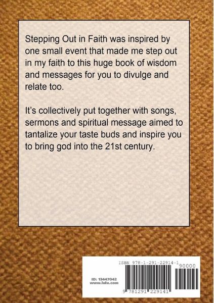 Stepping Out in Faith was inspired by one small event that made me step out in my faith to this huge book of wisdom and messages for you to divulge and relate too. It's collectively put together with songs, sermons and spiritual message aimed to tantalize your taste buds and inspire you to bring god into the 21st century.