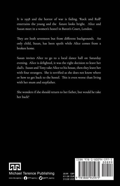 It is 1958 and the horror of war is fading. 'Rock and Roll' entertains the young and the future looks bright. Alice and Susan meet in a women's hostel in Baron's Court, London. They are both seventeen but from different backgrounds. An only child, Susan, has been spoilt while Alice comes from a broken home. Susan invites Alice to go to a local dance hall on Saturday evening. Alice is delighted, it was the right decision to leave her dad's. Susan and Tony take Alice to his house, then they leave her with four strangers. She is terrified as she does not know where or how to get back to the hostel. This is even worse than living with her mum and stepfather. She wonders if she should return to her father, but would he take her back?