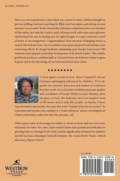 Have you ever experienced a time when you wanted to share a biblical thought or give an uplifting word and searching the Bible wasn’t an option, and relying on your memory was too risky? It isn’t unusual for Christians to find themselves in a situation of this nature and wish for a handy quick reference book with topics and a glossary alphabetized for ease in finding just the right thought or to give someone a word of praise or encouragement. Congratulations! Your selection of Stepping Stones is exactly that tool and more. Use it to enhance your personal growth and advance your witnessing efforts. Its design facilitates optimizing your Sunday School and VBS ministries and supports leadership development of all church leaders. This reliable guidebook produces confident faith in God and fosters the believer’s desire to grow in grace and in the knowledge of our Lord and Savior Jesus Christ.